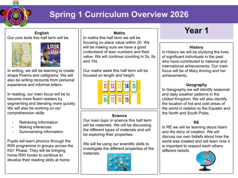 Welcome to Year 1. This year is an exciting step as children move from the Early Years into more structured learning, while still enjoying plenty of opportunities to explore, discover, and be creative. Our focus will be on building confidence in reading, writing, and maths, while encouraging curiosity through science, history, geography, and the arts.